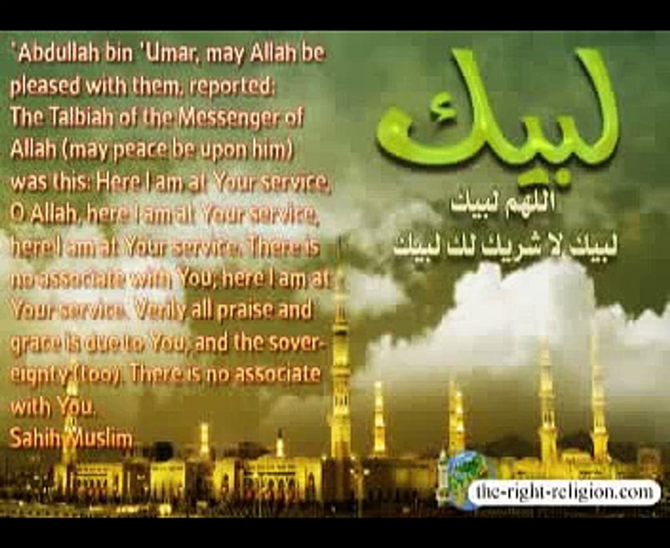 لبيك اللهم لبيك - اللَّهُمَّ إِنِّي أَعُوذُ بِكَ مِنَ الْعَجْزِ، وَالْكَسَلِ، وَالْجُبْنِ وَالْبُخْلِ، وَ الْهَرَمِ، وَالْقَسْوَةِ، وَالْغَفْلَةِ، وَالْعَيْلَةِ، وَالذِّلَّةِ، وَالْمَسْكَنَةِ، وَأَعُوذُ بِكَ مِنَ الْفَقْرِ، وَالْكُفْرِ، وَالْفُسُوقِ.. قناة القران الكريم • 22 тыс. اللَّهُمَّ إِنَّا دَعَوْنَاكَ فَاسْتَجِبْ لَنَا دُعَاءَنَا فَاغْفِرِ اللَّهُمَّ لَنَا ذُنُوبَنَا وَإِسْرَافَنَا في أَمْرِنَا. لبيك اللهم لبيك، لبيك لا شريك لك لبيك إن الحمد والنعمة لك والملك، لاشريك لك. لبيك اللهم لبيك — праздничный такбир. حاضر ہوں ، اے میرے رب میں حاضر ہوں، تیرا کوئی شریک نہیں، میں حاضر ہوں۔
